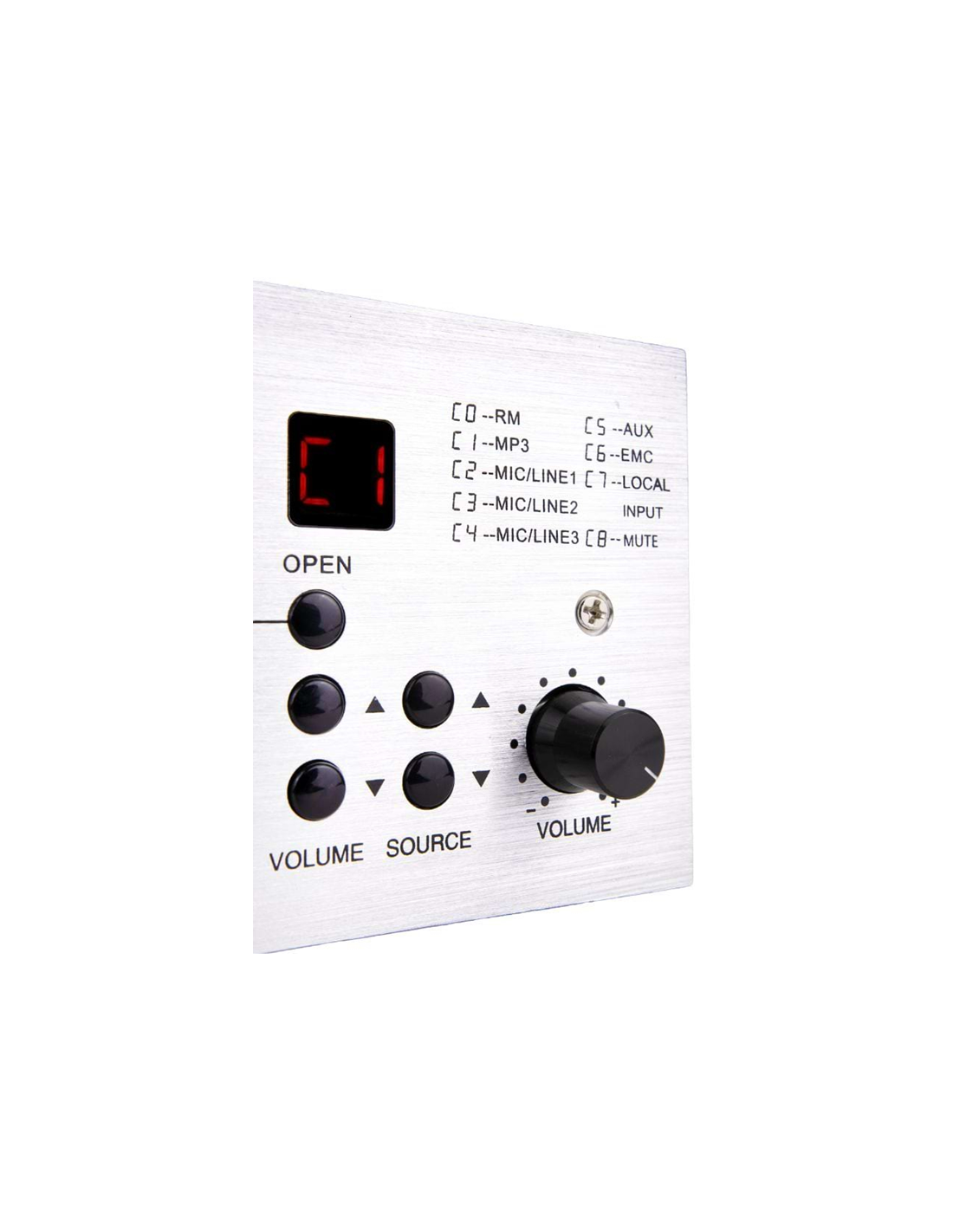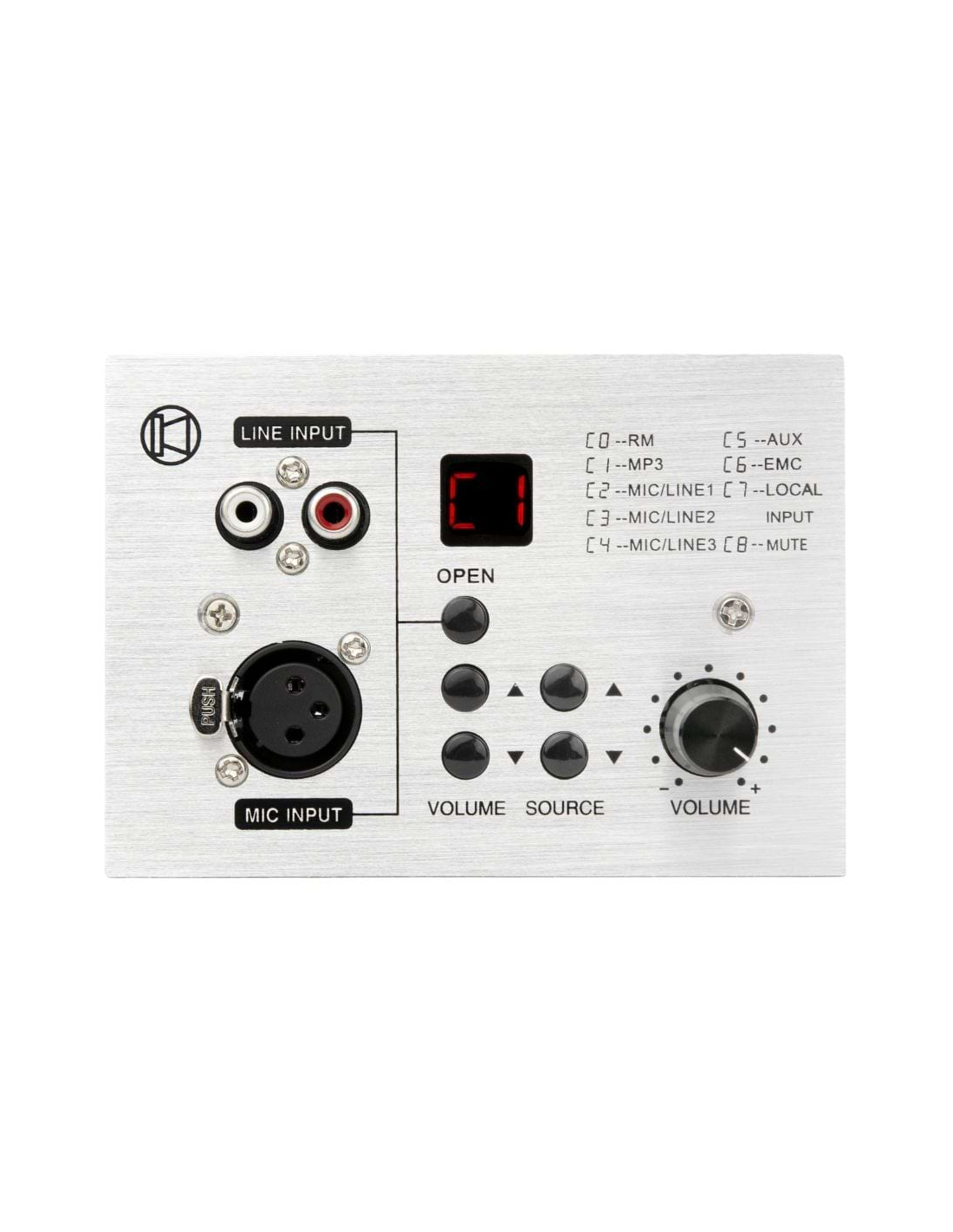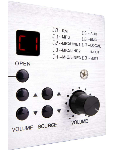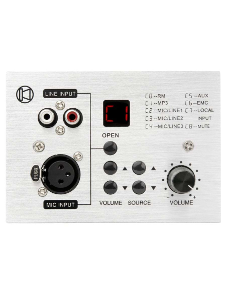 La connexion à l’amplificateur matriciel s’effectue par RJ-45, garantissant une installation simple et fiable. Les boutons de commande permettent de régler le volume et de sélectionner la source audio, tandis que l’affichage LED offre une excellente lisibilité de l’état du système.