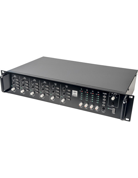 Équipée de 6 entrées audio (4 entrées micro/ligne XLR-Jack combo + 2 entrées ligne RCA) et de 4 sorties de zones, cette table de mixage matricielle permet un routage simple et rapide directement en face avant. Chaque entrée dispose d’un réglage de tonalité grave/aigu, ainsi que d’une alimentation fantôme 15 V pour microphones professionnels.