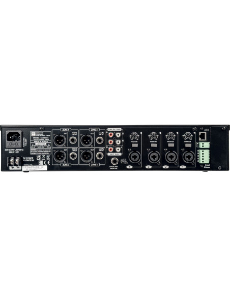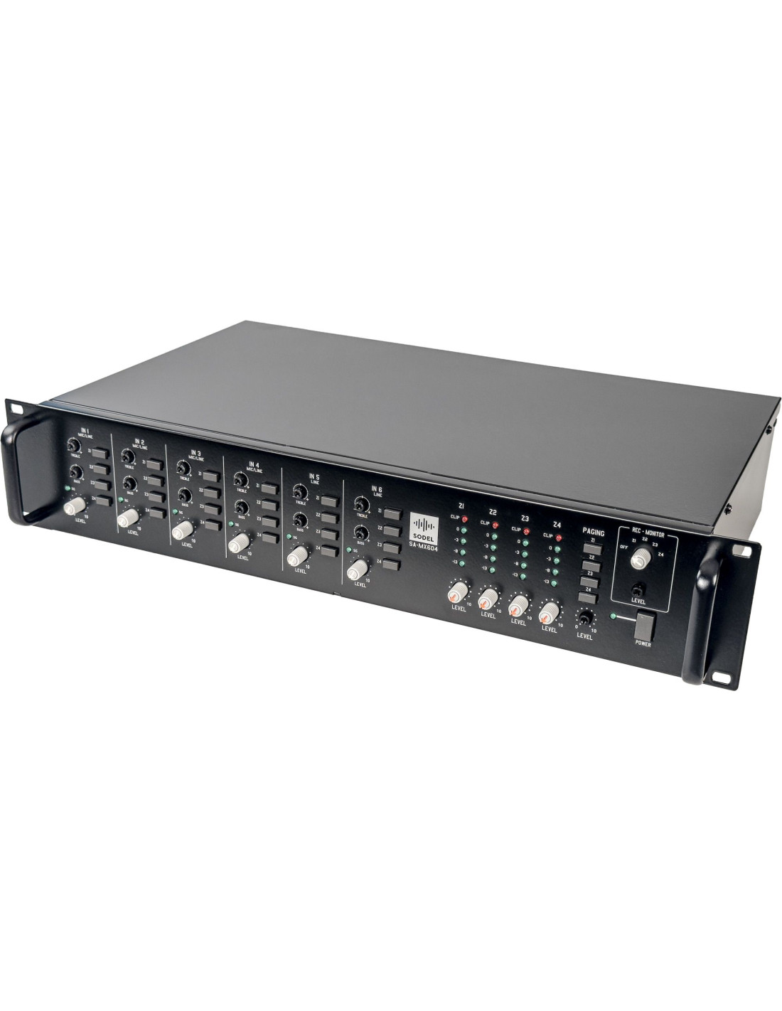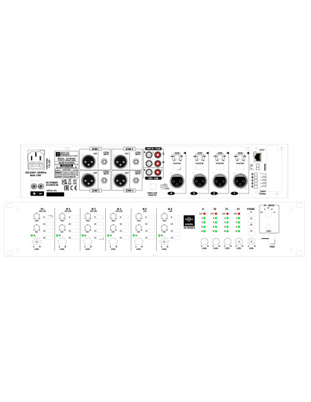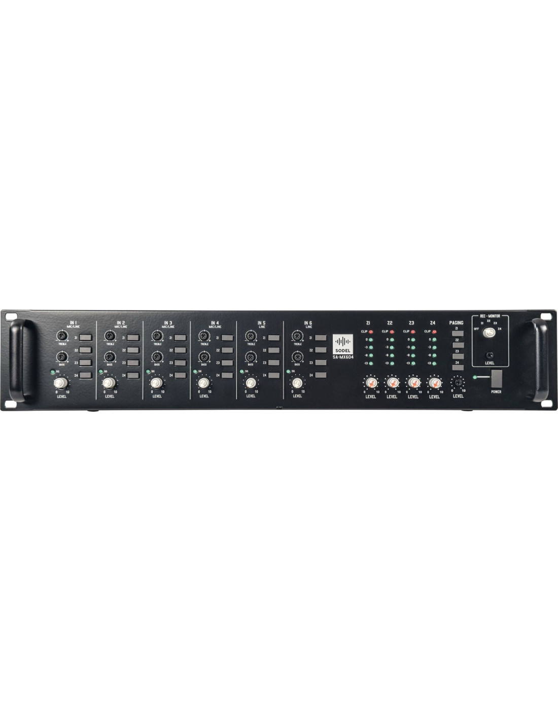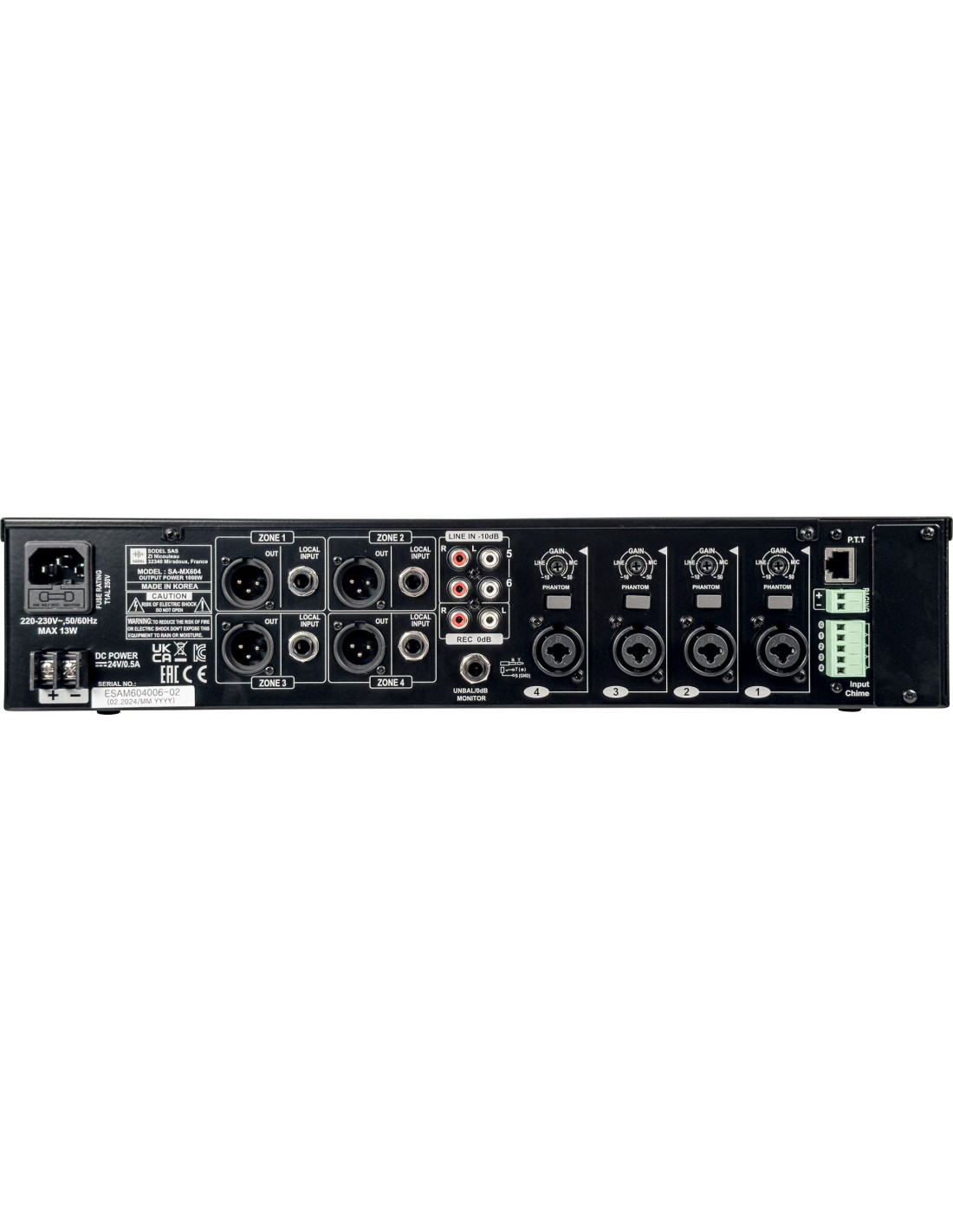 Grâce à sa double alimentation 230 V + 24 V DC, la SA-MAT604 assure une continuité de service, essentielle pour les installations professionnelles et les systèmes d’annonce. Son format rack 19 pouces – 2U permet une intégration facile dans une baie technique ou un rack de sonorisation.