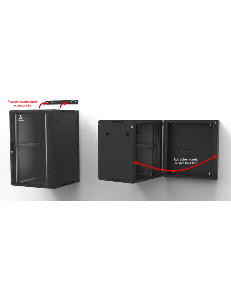 La porte en verre sécurisée, équipée d’une poignée pivotante avec serrure, protège efficacement le matériel tout en offrant une présentation soignée et professionnelle dans les lieux accessibles au public. Les panneaux latéraux démontables et verrouillables simplifient l’entrée des câbles et les interventions latérales.
