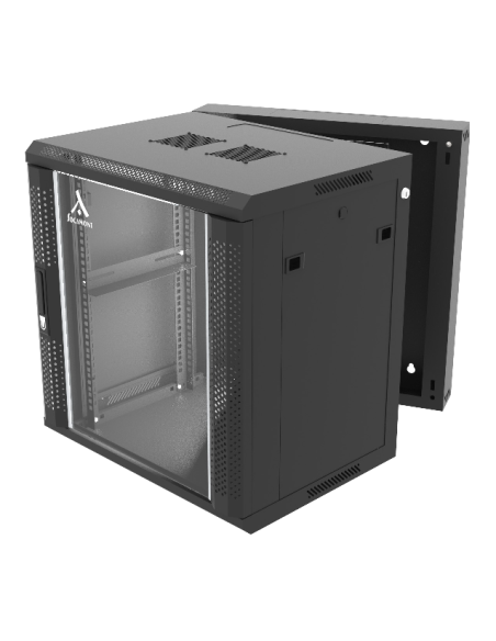 La porte en verre avec ouverture à 180°, associée à une poignée pivotante avec serrure, assure une protection efficace du matériel tout en conservant une présentation élégante et professionnelle. Les panneaux latéraux démontables et verrouillables permettent une gestion des câbles propre et flexible, même dans des espaces restreints.