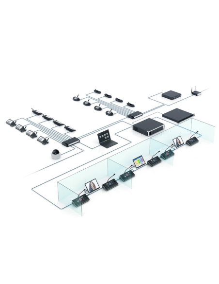 Le pupitre est entièrement conforme à la norme internationale ISO 20109, garantissant une qualité audio professionnelle et une compatibilité avec les standards des systèmes d’interprétation modernes.