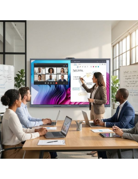 C’est un véritable écran tout-en-un (écran + caméra + micro + tactile) conçu pour les réunions hybrides fluides et naturelles.